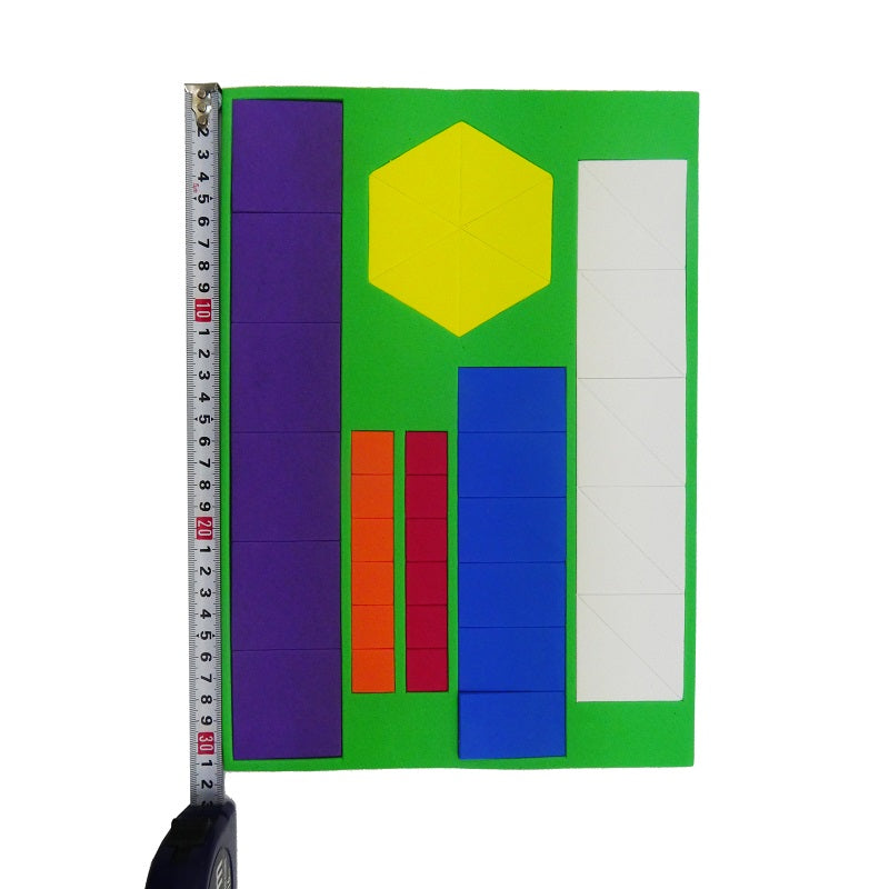 3) Removable fraction foam pieces in a comparison chart for half, one-third, one-quarter, one-fifth, one-sixth and one-seventh. Size of foam 21 cm by 30 cm